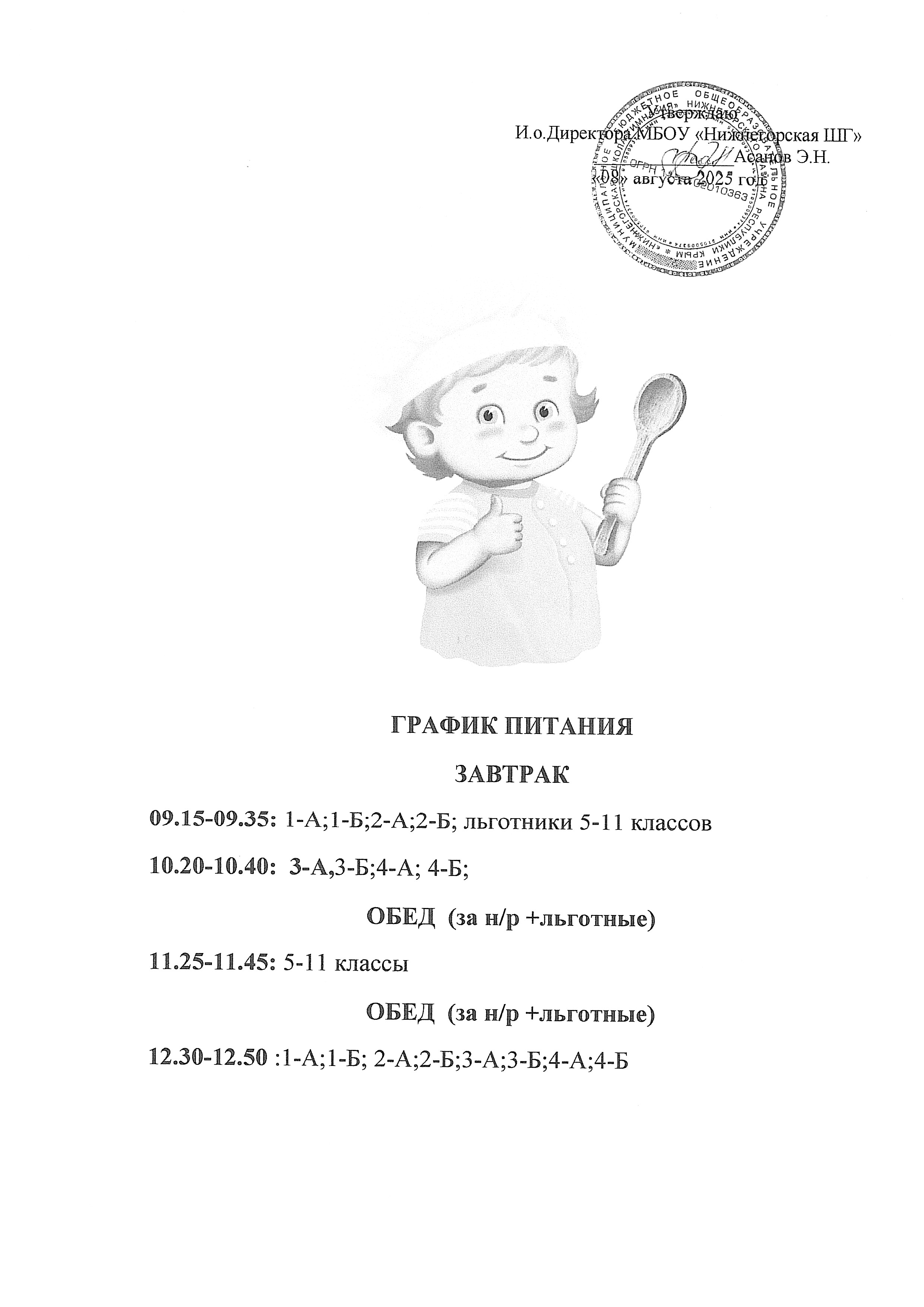 Приказом директора МБОУ «Нижнегорская школа-гимназия» ответственной по питанию назначена медицинская сестра Червякова Людмила Николаевна, а в ее отсутствие на зам.директора Новак Викторию Евменовну (приказ № 707 от 28.08.2025 г ) в их обязанности входит: